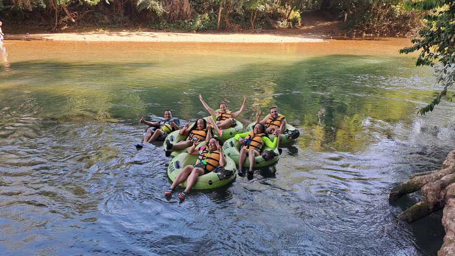 After a scenic one-hour drive from Belize City, gear up with your tube, headlamp, and life jacket, then enjoy a guided rainforest hike to the cave entrance. Once afloat, you’ll drift through cathedral-like caves adorned with stalactites and stalagmites, connected in a fun tube chain as you glide along cool, crystal-clear waters.